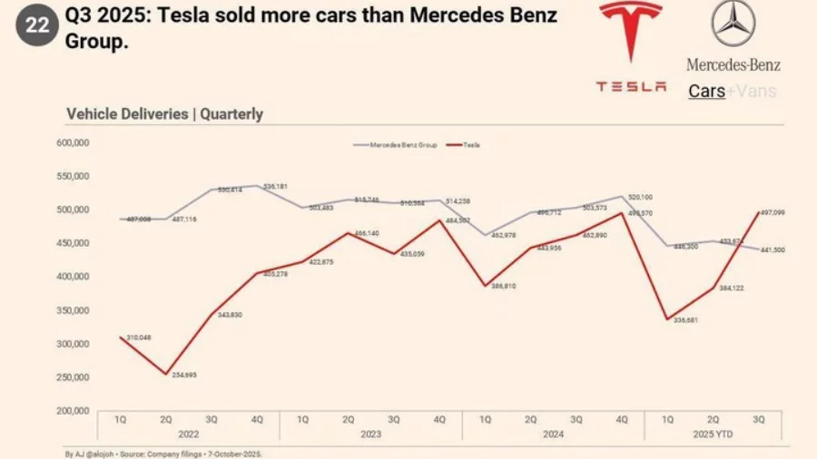 Жорий йилнинг учинчи чорагида Tesla 497 099 та автомобил сотган бўлса, Mercedes 441,5 мингта машина сотишга муваффақ бўлган. Шу тариқа, Илoн Маск раҳбарлик қилаётган компания рақибидан 12,6 фоизга кўпроқ савдо амалга оширди.