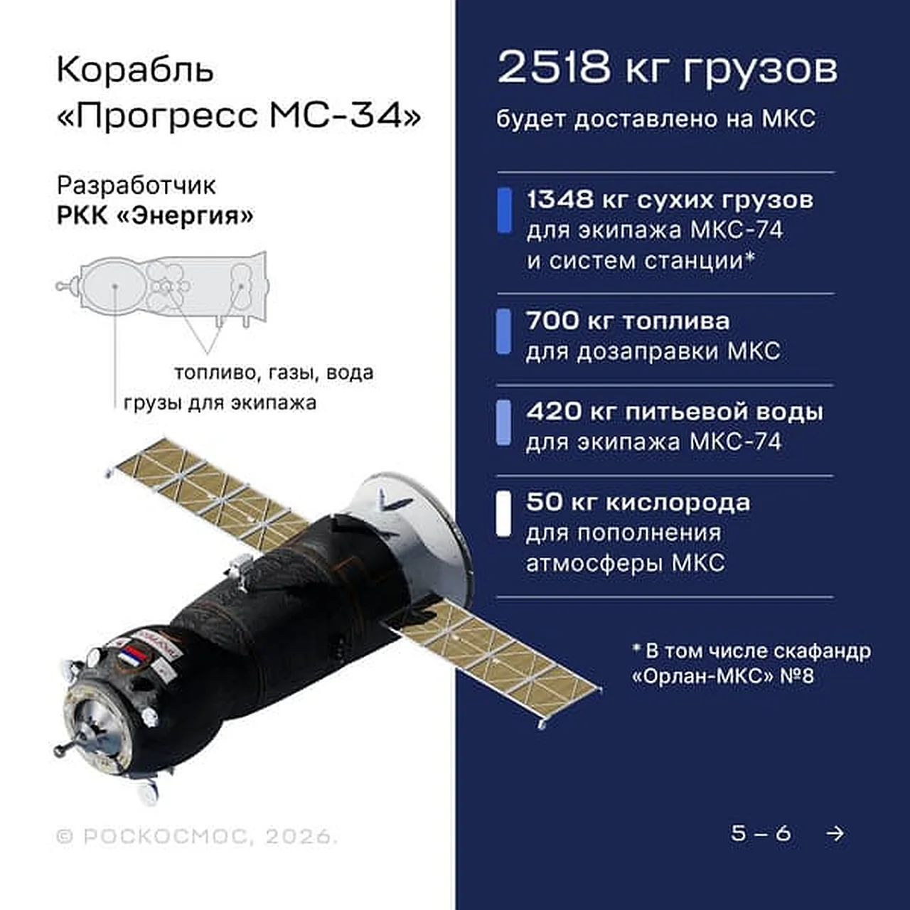 Außerdem werden 1.348 kg Trockenfracht für die Besatzung geliefert, darunter ein neuer Raumanzug „Orlan-MKS“ Nummer 8.