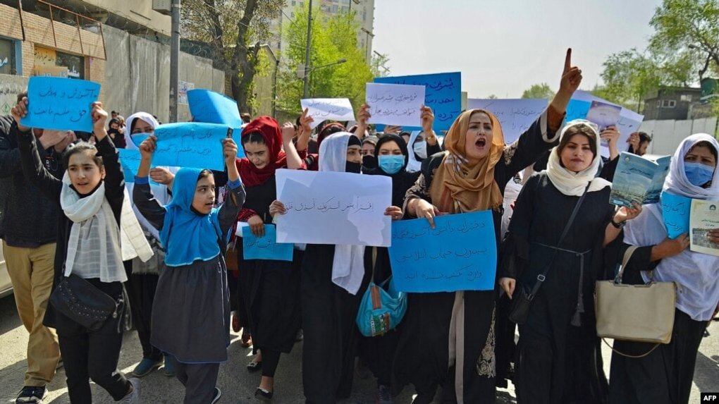 Афғонистон аёллари қизлар учун ўрта мактаблар очилишини талаб қилиб, мамлакат Таълим вазирлиги олдида намойиш ўтказмоқда. Кобул, 2022 йил 26 март. Фото: Reuters