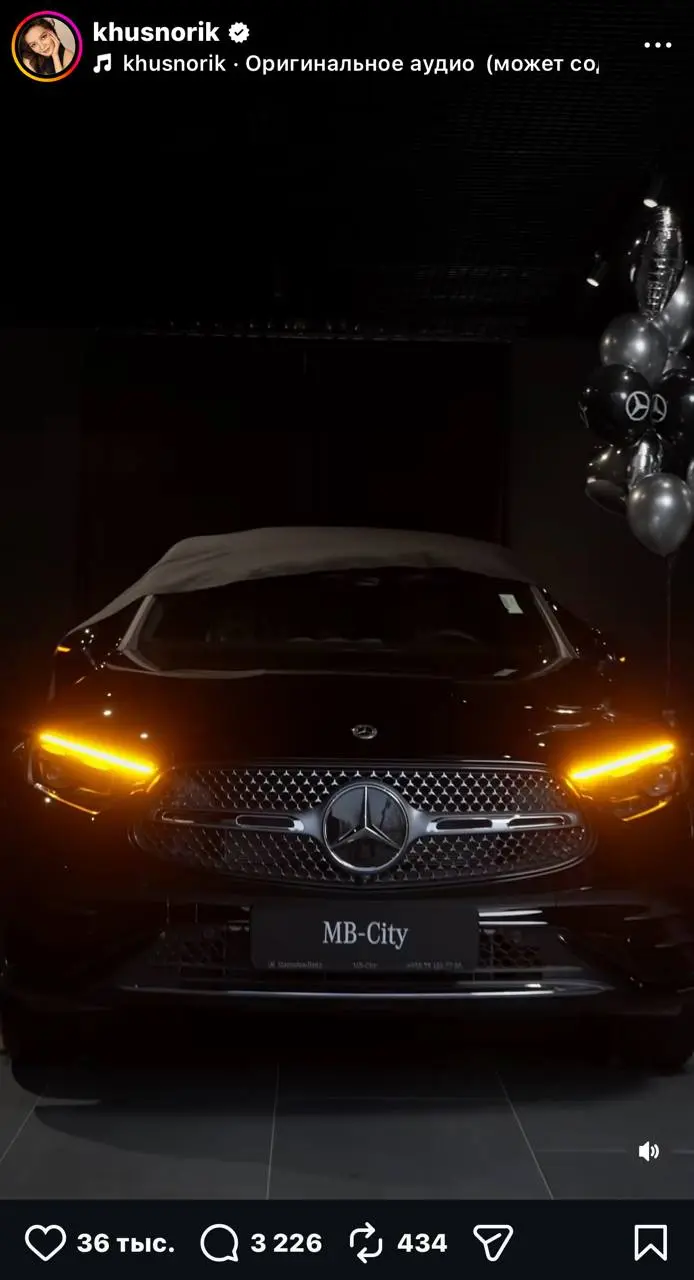 Khusnora Shodiyeva (Khusnorik), a blogger and singer who is widely known on her social networks, shared a video about her purchase of a new car. She joyfully announced in the video that she had received a new Mercedes. The car is black, and Khusnora Shodiyeva shared this news with her followers.