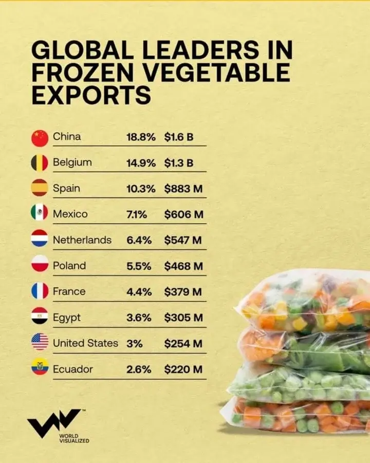Following China are Belgium ($1.3 billion, 18.9%) and Spain ($883 million, 10.3%). This trio accounts for a significant portion of the world's frozen vegetable exports.