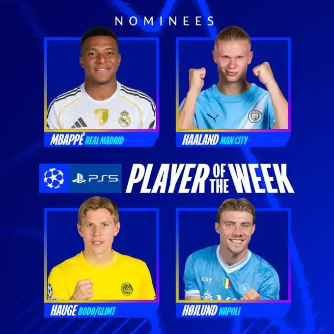 Following the second round of the Champions League, UEFA announced the nominees for Player of the Week. The list includes Real Madrid captain Kylian Mbappé, Manchester City striker Erling Haaland, Napoli forward Rasmus Hojlund, and Budø-Glimt player Jens-Petter Hauge.