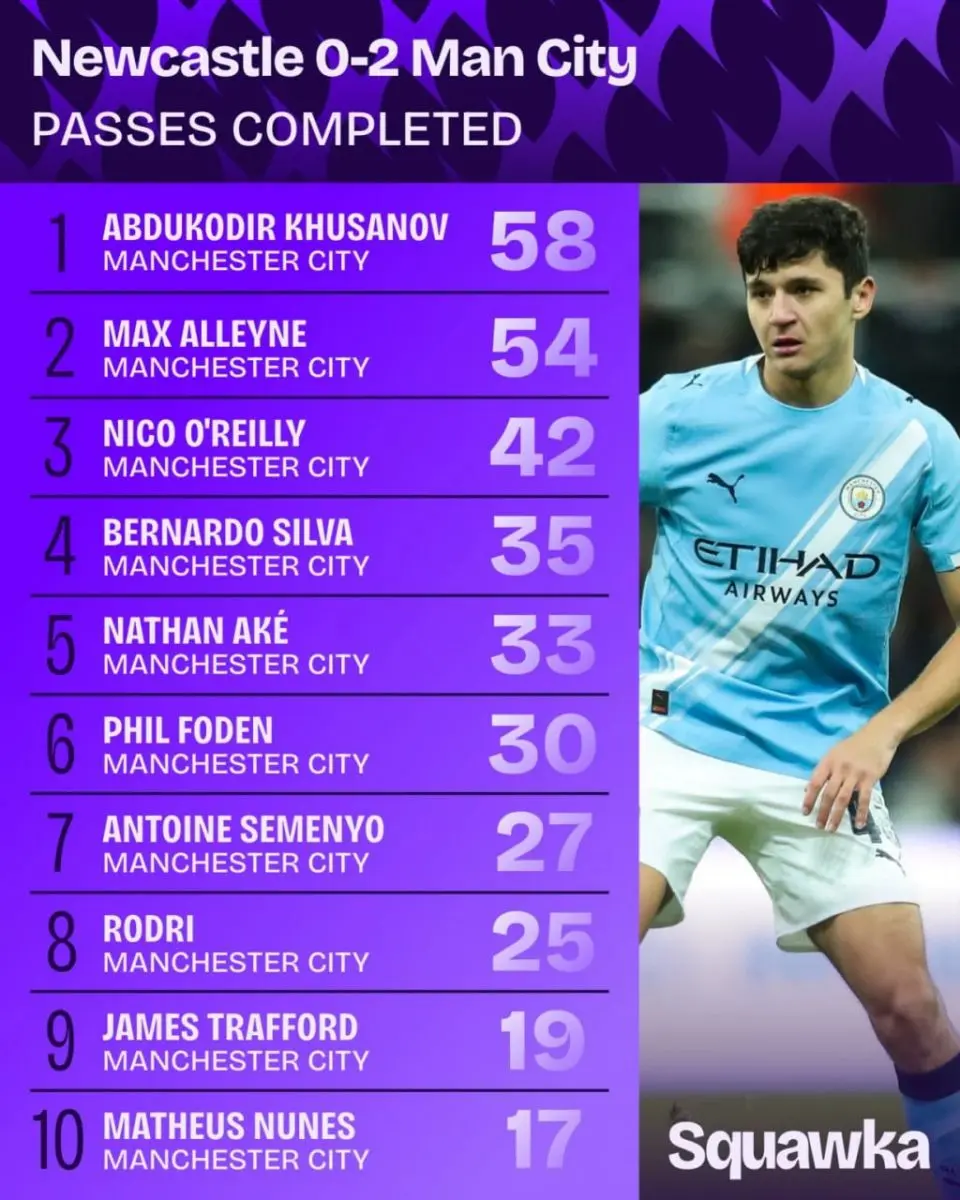 For a defender, it's important not only to break, but also to play with the ball. In the match against "Newcastle," Khusanov also made the most passes: he made 58 assists. Most importantly, 93.5% of the passes were targeted. This indicator means that a young defender can be a "building material" for the team in positional play.