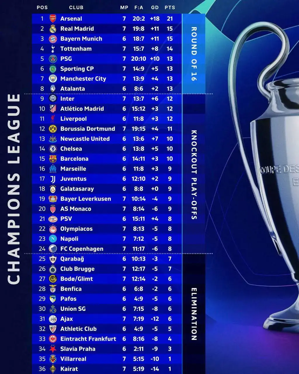 A series of matches from the 7th round of the UEFA Champions League has concluded, and this evening brought football fans both a full-fledged drama and a golden celebration. Real Madrid crushed their opponents in Madrid, while Arsenal proved their current form once again in Milan. Reigning champions PSG suffered a painful defeat in Portugal.