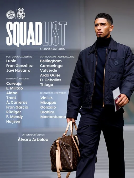Álvaro Arbeloa has mobilized all key players for this important match. Below is the official squad of Real Madrid for the upcoming fixture: