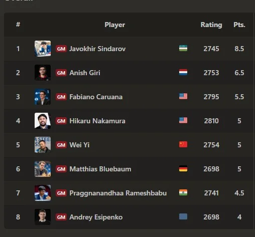 À l’heure actuelle, Sindarov totalise 8,5 points et occupe seul la première place du classement du tournoi. Son poursuivant le plus proche, le grand maître néerlandais Anish Giri, compte 6,5 points et occupe la deuxième place.