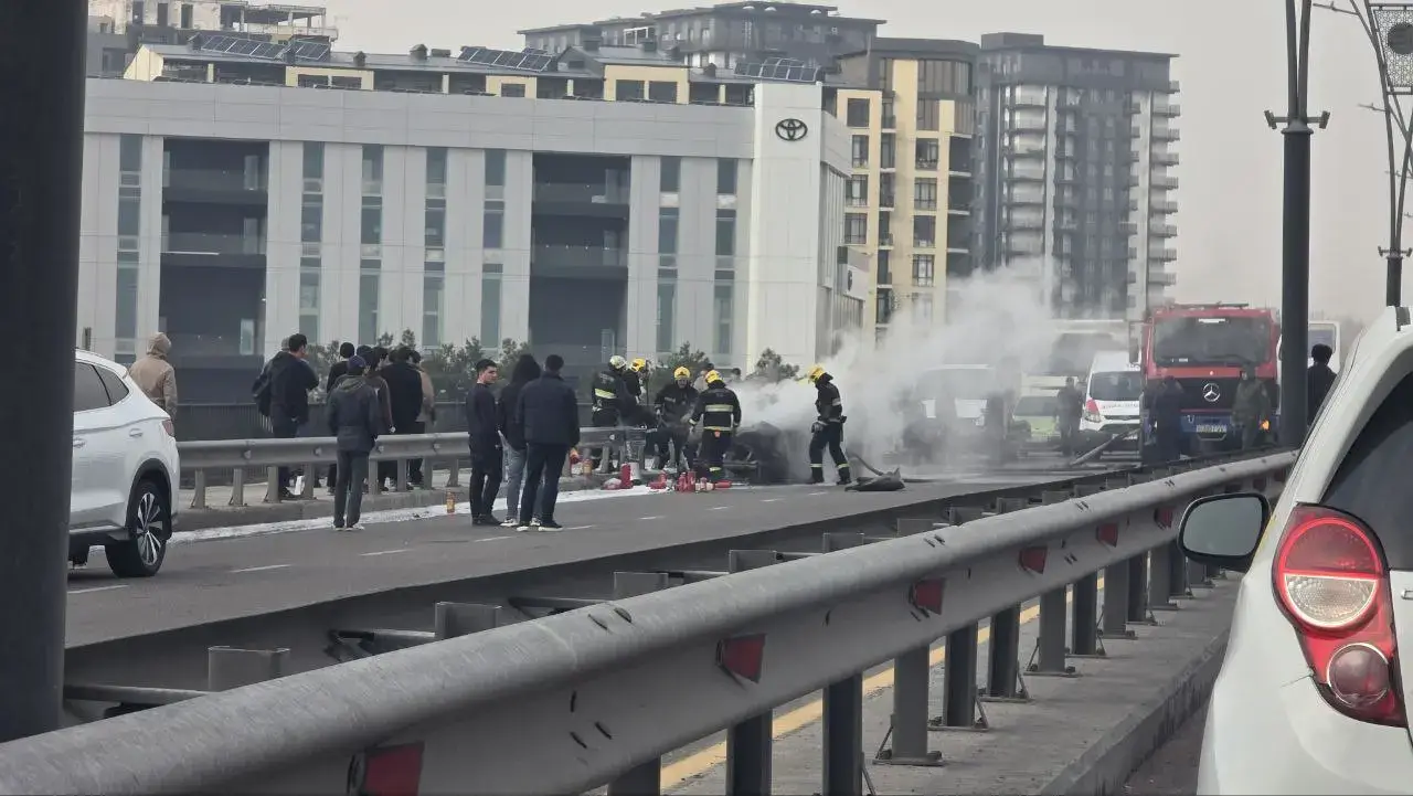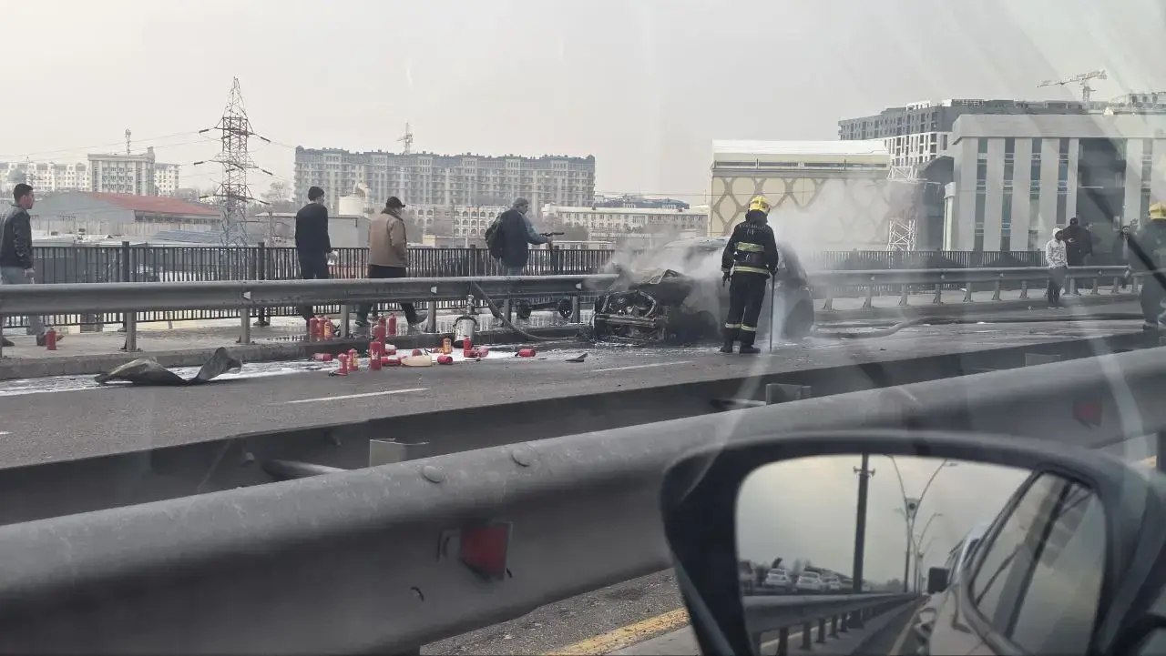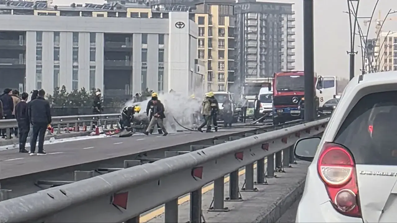 Тошкент шаҳрида “Спарк” русумли автомашинада ёнғин чиқди. Ҳодиса жойидан олинган суратларда қутқарувчилар ва ёнғин-қутқарув техникаси машинани ўчириш ишларини олиб бораётгани, йўл қисмида тутун кўтарилгани ҳамда ёнғин ўчириш кўпиги қўлланилгани кўринади. Йўлнинг бир қисми вақтинча чеклангани сабаб ҳаракат секинлашган.