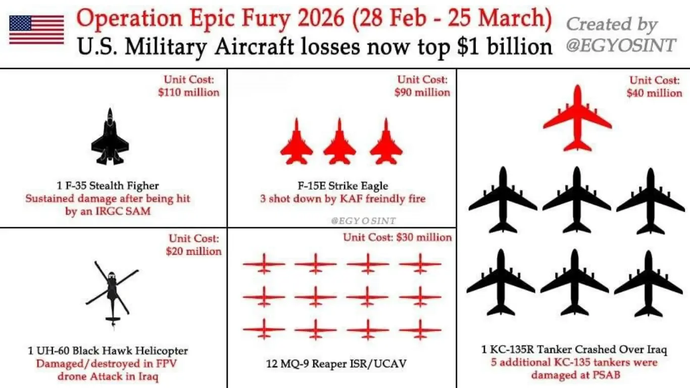 Таяу Шығыстағы шиеленіс аясында АҚШ Әскери-әуе күштері елеулі шығынға ұшырағаны туралы ақпарат тарап жатыр. Дереккөздерге қарағанда, түрлі шабуылдар мен техникалық оқиғалар салдарынан бірқатар әуе техникасы істен шыққан немесе толығымен жойылды.