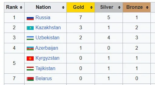 Төртінші орынды Әзербайжан құрамасы иеленді. Олар 1 алтын және 2 қола медальмен чемпионатты аяқтады. Қырғызстан мен Тәжікстан құрамалары 1 күміс және 1 қола медальмен бесінші–алтыншы орындарды бөлісті. Беларусь құрамасы кестеде 1 күміс медальмен тіркелді.