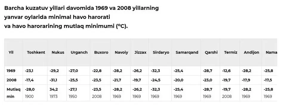 Мамандардың айтуынша, қаңтар айы Өзбекстанда әдетте суық және жылы кезеңдердің жиі ауысуымен ерекшеленеді. Ай бойы қатаң суық сақталатын жылдар сирек кездеседі. Бақылаулар тарихындағы ең суық қаңтар айлары 1969 және 2008 жылдарға сәйкес келді, сол кезде ауа температурасы нормадан 8-12 градус төмен болды. Соңғы онжылдықтарда, керісінше, жылы қаңтар айлары жиі тіркелуде.