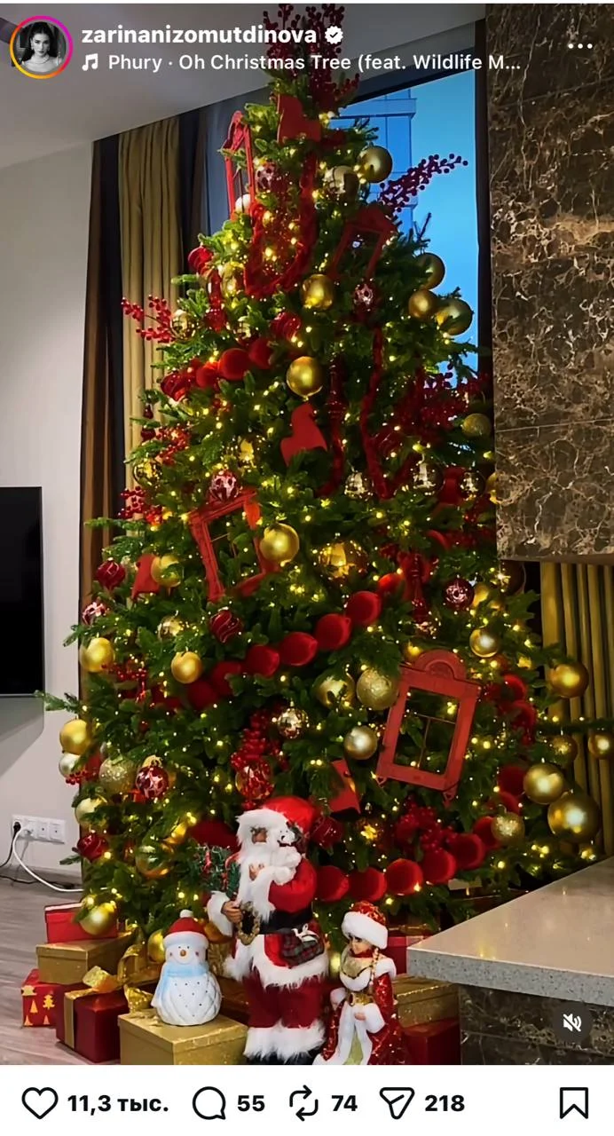 Актриса видеода уйининг бурчагида жойлашган, ёрқин чироқлар билан безатилган, замонавий услубда ясалган Янги йил арчасини намойиш этди. Зарина Низомутдинованинг издошлари шарҳларда актрисанинг нозик дидини мақтаб, яқинлашиб келаётган байрам билан табрик изоҳларини қолдиришди.