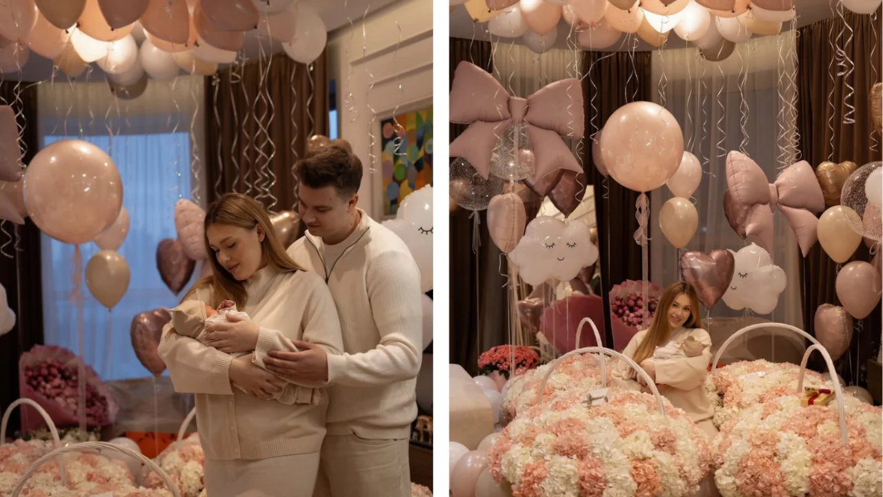 На снимках родители с любовью прижимают девочку к себе, а окружающая атмосфера напоминает праздничную встречу долгожданного чуда. В комнате множество цветов, воздушных шаров и мягкий свет создаёт настоящее домашнее тепло.