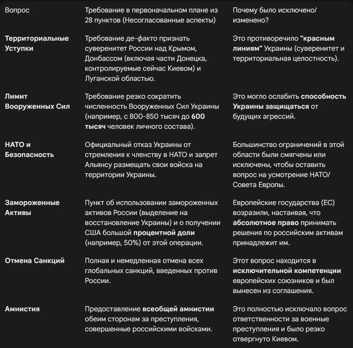 По данным источников СМИ, из новой версии исключены наиболее спорные пункты. ABC News отмечает, что в нем отсутствует требование о сокращении численности вооруженных сил Украины и полной амнистии за действия во время конфликта. Также был снят пункт о направлении только 100 миллиардов долларов из замороженных российских активов на восстановление Украины из-за решительного сопротивления ЕС. По данным Politico, территориальные вопросы были выведены за рамки плановой программы и отложены на диалог между Трампом и Зеленским.