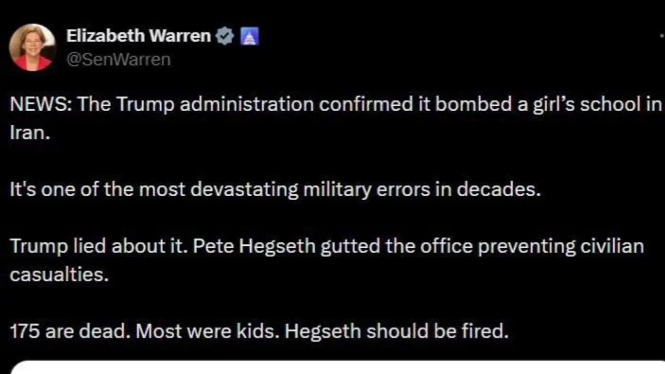 Сенатор США Элизабет Уоррен выступила с резким заявлением по поводу удара по школе для девочек в Иране.
