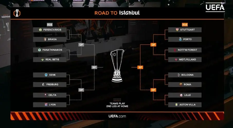 После жеребьевки с участием бывшего игрока сборной Португалии Манише были определены пары для 1/8 финала Лиги Европы УЕФА. Жеребьевка состоялась 27 февраля в Ньоне, Швейцария, в Доме европейского футбола, и был определен следующий маршрут турнира.