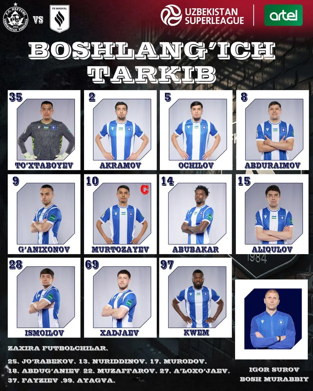 Уже по стартовому составу можно почувствовать, что "Машъал" прибыл на сегодняшний матч с серьезной подготовкой. В составе "Мубарек" ворота будет защищать Достонбек Тухтабоев. Перед ним выступят Зафарбек Акрамов, Самандар Очилов, Сардор Абдураимов, Иброхим Ганихонов, лидер и капитан команды Хумоюн Муртозаев, Абдул Рашид Абубакар, Мухаммадали Аликулов, Эргаш Исмоилов, Роман Хаджиев и Аугустин Чиди Квем. Эти имена в составе означают, что "Машъал" также выйдет на поле с боевым духом и сильным стремлением к очкам.