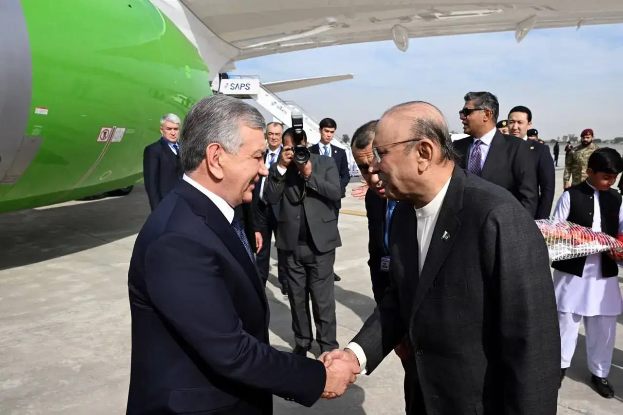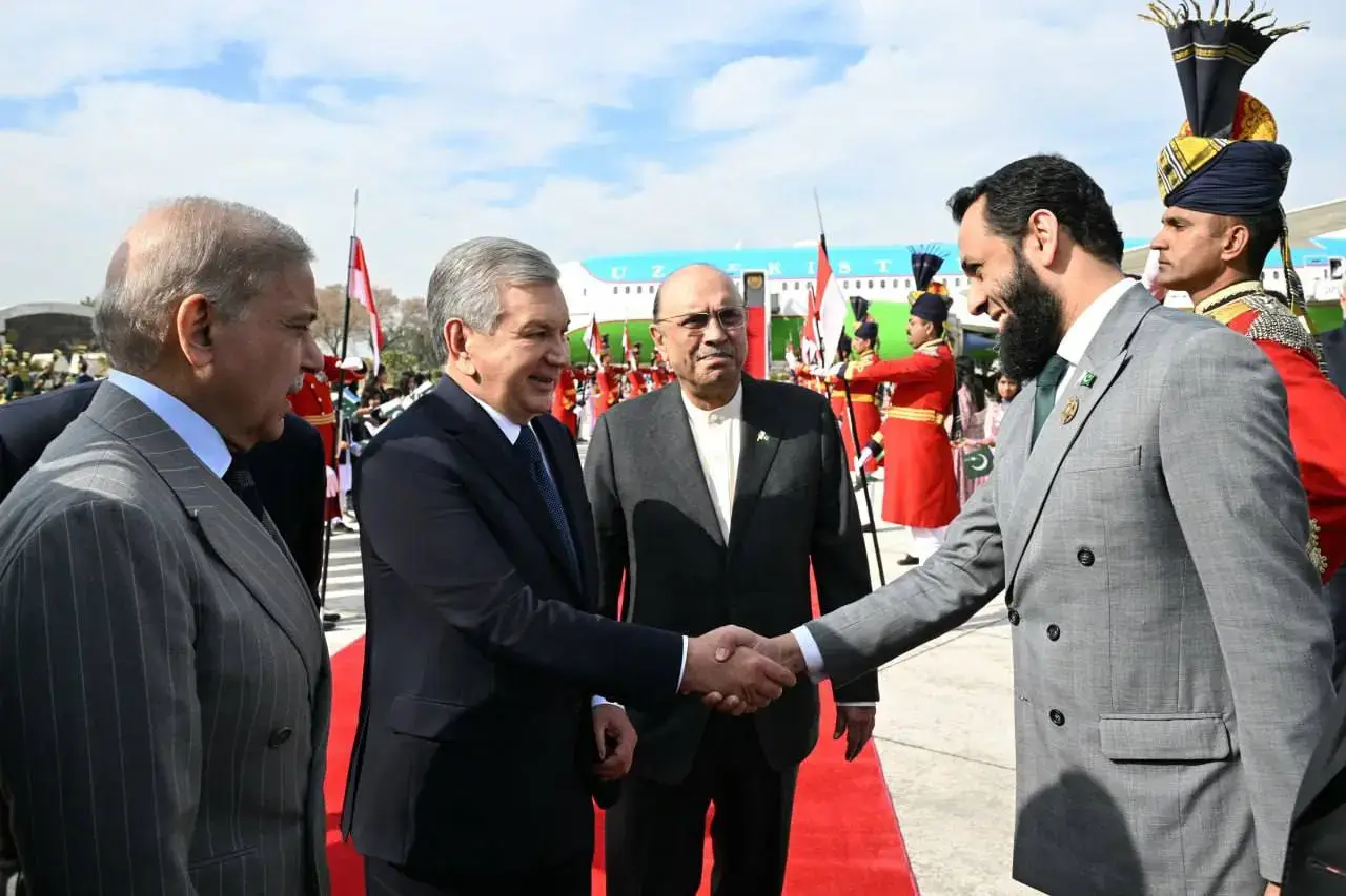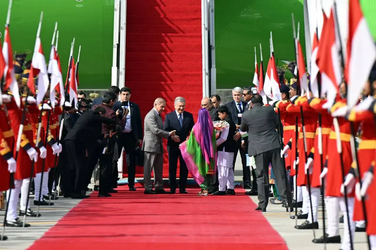 В аэропорту "Нурхан" в Исламабаде главу Узбекистана торжественно встретили премьер-министр Пакистана Шахбаз Шариф, президент Асиф Али Зардари и другие официальные лица. Во время церемонии были высоко подняты флаги двух стран, выстроен почетный караул, и была выражена реакция в соответствии с официальным протоколом.