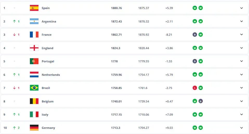 Шу билан бирга, умумжаҳон рейтингининг юқори қисмида ҳам ўзгариш кузатилди: Испания терма жамоаси 2014 йилдан бери илк бор дунёдаги етакчи ўринга чиқди. Аргентина Францияни ортда қолдириб, иккинчи поғонага кўтарилди.