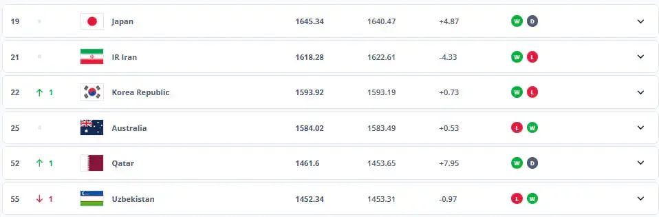 Янгиланган кўрсаткичларга кўра, Япония 1645,34 очко билан 19-ўринни сақлаб қолган. Ундан кейинги ўринларда Эрон (21-ўрин, 1618,28 очко), Корея Республикаси (22-ўрин, 1593,92 очко), Австралия (25-ўрин, 1584,02 очко) ва Қатар (52-ўрин, 1461,6 очко) жой олган.
