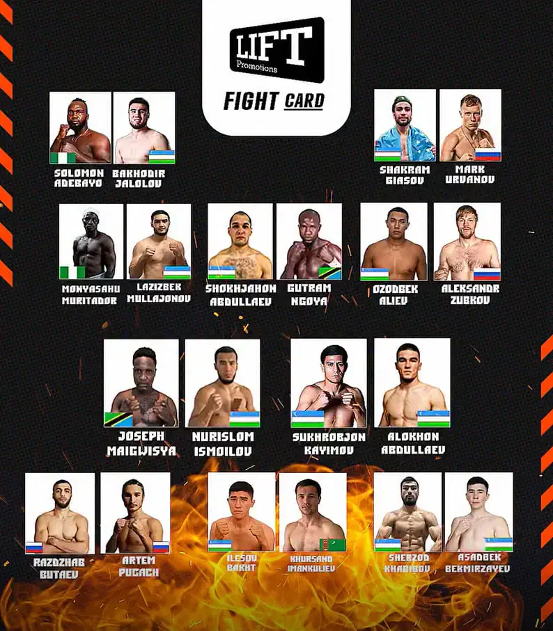 Кечги тадбирнинг марказий баҳсида иккита катта жанг — Баҳодир Жалолов ва Шаҳрам Ғиёсов иштирокидаги дуэллар туради. Олимпиада чемпиони ва профессионал боксдаги катта номга айланган Жалолов бу сафар нигериялик кучли нокаутчи Соломон Адебайога қарши рингга чиқади. Айнан қизиқ жиҳат — Адебайо ҳалигача мағлубият нималигини билмайди: 14 та жанг, 14 та ғалаба ва 13 та эрта тўхтатилган жанг. Демак, кечанинг энг кучли тўқнашувларидан бири шу бўлади.