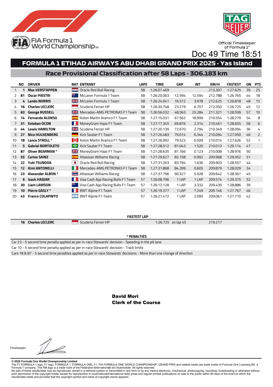 Абу-Дабидаги ёрқин ва шиддатли финал билан Формула-1нинг навбатдаги мавсуми ниҳоясига етди. Бу галги якун бир нечта драма, интрига ва кутилмаган бурилишлар билан тўлди. Энг муҳими — «Макларен»нинг ёш юлдузи Ландо Норрис якшанба куни расман ўз карьерасида илк бор жаҳон чемпионига айланди.