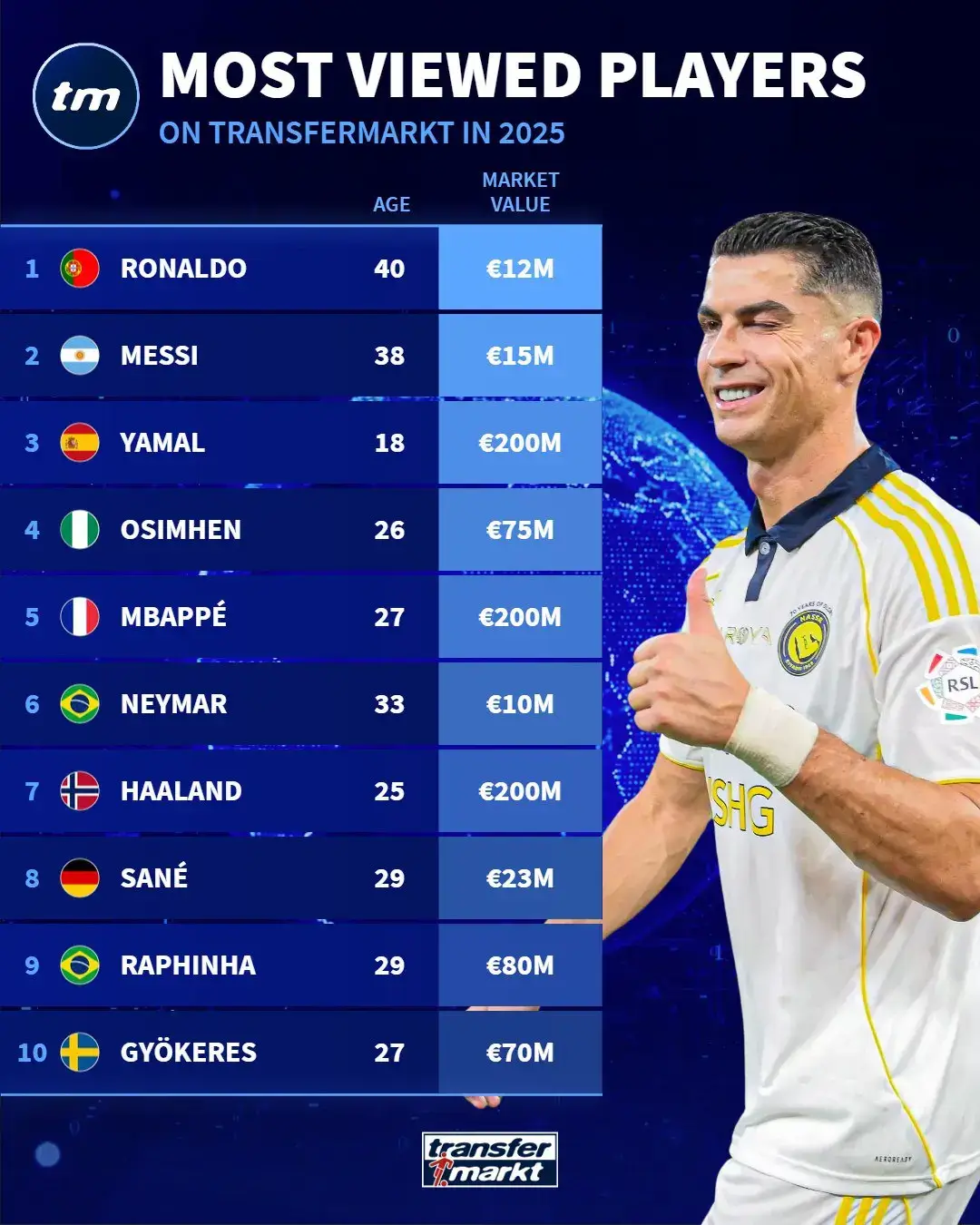 Transfermarkt интернет-портали 2025 йил давомида ўз сайтида энг кўп томоша қилинган футболчилар рўйхатини эълон қилди. Ушбу рейтинг футбол ишқибозлари орасида қайси ўйинчиларга қизиқиш юқори эканини яққол кўрсатиб берди.