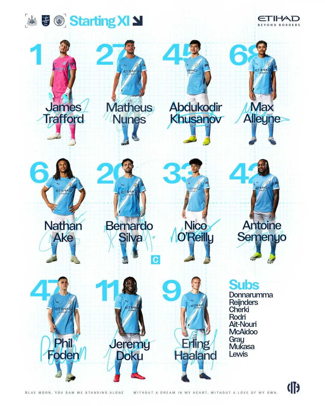 "Нюкасл"га нисбатан «Манчестер Сити» асосий таркиб билан майдонга тушади, уларнинг сафида Траффорд, Нунес, Ҳусанов, Аллейн, Аке, О’Райли, Семенё, Доку, Фоден, Силва ва Ҳоланд жамоа билан курашишга тайёр.