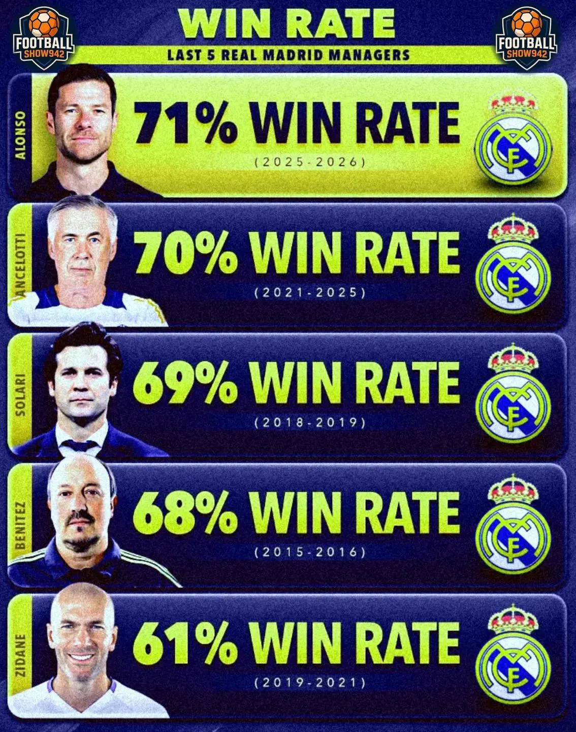 Хаби Алонсо 2025–2026 йилларда «Реал Мадрид»ни бошқаришни бошлади ва дарҳол яхши натижаларга эришди. Унинг 71% ғалаба кўрсаткичи охирги мураббийлар орасида энг юқори натижа бўлиб, клубда умидлар уйғотди. Алонсонинг тактик билимлари ва клубнинг фалсафасини тушуниши унинг бошқарувида клуб учун яхши натижаларга олиб келиши кутилган эди.