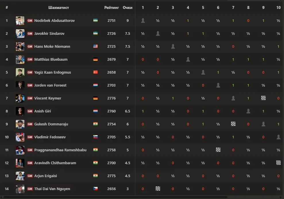 Турнир жадвалида етакчиликни қўлдан бермай келган Абдусатторов 1 февраль куни ўтказилган сўнгги баҳсда ҳиндистонлик кучли рақиб Аржун Эригайсини мағлуб этди. Қуйида тақдим этилган натижалар жадвалига кўра, Нодирбек турнир давомида ҳайратланарли барқарорлик намойиш этган: