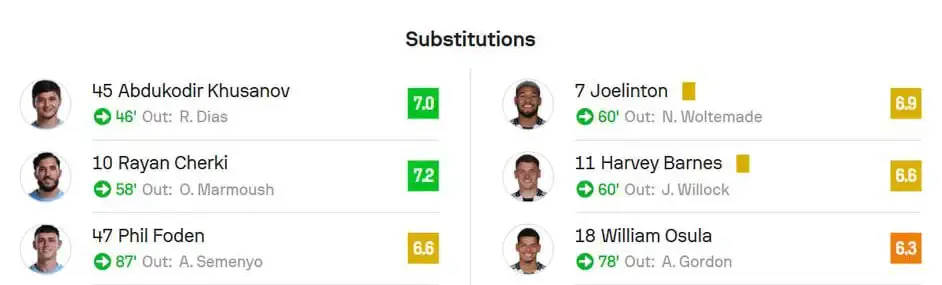 Манчестердаги баҳсда дублга эришган Нико O’Райли ўйиннинг энг яхши футболчиси деб топилди — 8,7 балл. Родри эса 8,6 балл билан ўйиннинг энг яхши иккинчи футболчиси бўлди.