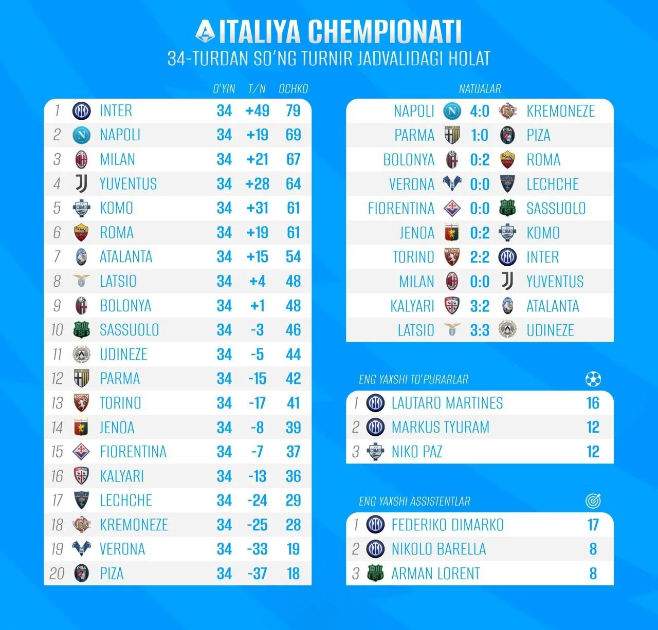 Италия А Сериясида 34-турдан кейинги вазият чемпионатдаги кучлар нисбати аниқ шаклланганини кўрсатмоқда. Жадвал тепасидаги жамоалар нафақат очколар, балки ўйин сифати ва барқарорлик бўйича ҳам сезиларли фарқ билан ажралиб турибди.