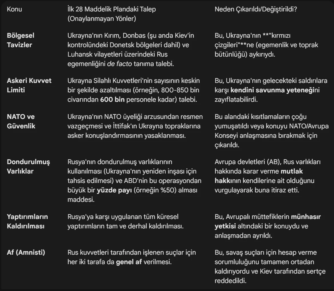 Medya kaynaklarına göre, yeni sürümden en tartışmalı maddeler çıkarıldı. ABC News, Ukrayna Silahlı Kuvvetleri'nin azaltılması ve çatışma sırasındaki eylemler için tam af talebinin içermediğini belirtti. Ayrıca, Avrupa Birliği'nin katı direnişi nedeniyle, Rusya'nın dondurulmuş varlıklarından yalnızca 100 milyar doların Ukrayna'nın yeniden inşasına yönlendirilmesi hükmü de kaldırıldı. Politico'ya göre, bölgesel konular program çerçevesinden çıkarıldı ve Trump ile Zelenskyy arasındaki diyaloğa bırakıldı.