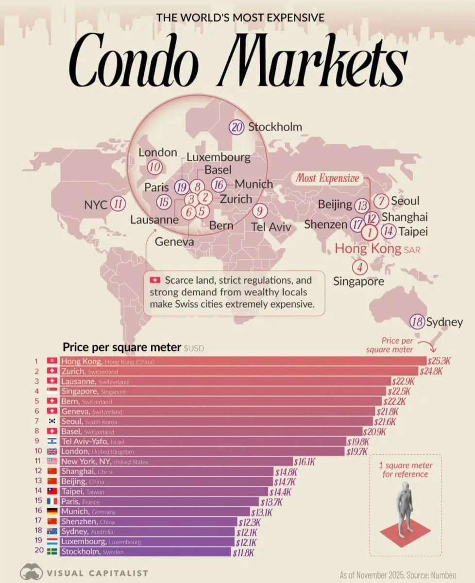Sıralamanın mutlak lideri Hong Kong'dur. Oradaki konutun her metrekare başına ortalama 25.339 dolar. Hong Kong'un uzun süredir lider olmasına birkaç faktör katkıda bulunmaktadır: sınırlı arazi alanı, yüksek nüfus yoğunluğu, gelişmiş altyapı ve Asya'nın en büyük finans merkezlerinden biri olarak megapolisin cazibesi.
