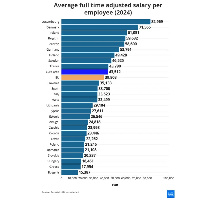 Avrupa'da maaşlar çok çeşitlidir. Bunlar sadece sektörler bağlamında değil, aynı zamanda ülkeler bağlamında da önemli ölçüde farklılık göstermektedir. Euronews ve Eurostat tarafından sağlanan verilere göre, AB'de çalışan başına düşen ortalama yıllık maaş 39.808 avro'dur. Bu rakam genel bir göstergedir ve gerçek durum ülkeler arasında çok büyük farklılıklara sahiptir.