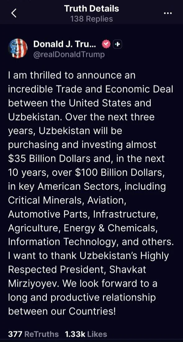 Özbekistan, son yıllarda ABD ile ilişkilerini istikrarlı bir şekilde genişletiyor. Trump'ın bu gönderisinden sonra, birçok uluslararası yayın bunu "Orta Asya'da ABD'nin etkisinin güçlenmesi ve Taşkent'in jeoekonomik itibarının artması" olarak nitelendirdi.