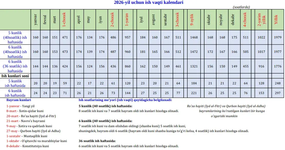 Bu çalışma saatleri takviminin, İş Kanunu, Özbekistan Cumhuriyeti Cumhurbaşkanı'nın "2026 yılında resmi tarihlerin kutlanması sırasında ek çalışma dışı günlerin belirlenmesi ve tatil günlerinin ertelenmesi hakkında" Kararnamesi ve 2025 ve 2026 takvimleri temelinde hazırlandığı bildirildi.