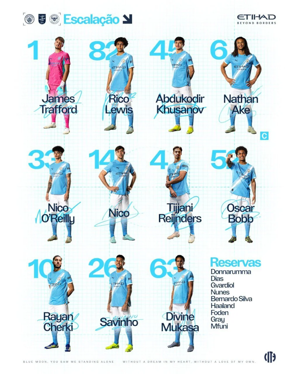 Josep Guardiola, yarı final gibi önemli bir maçta genç ve deneyimli oyuncuları bir araya getiren bir kadro seçti. Kapıyı James Trafford koruyor. Riko Lewis, Abdukodir Khusanov, Nathan Ake ve Nico O'Reilly savunmada yer alıyor. Saha merkezinde, Niko, Tijani Reynders ve Oscar Bobb maçı yönetecek. Hujum hattında Ryan Scherky, Savino ve Divane Mukasa'ya güven duyuldu.