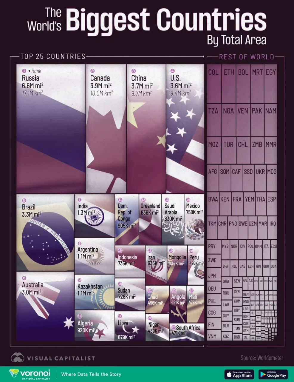 Sayyoradagi eng yirik to‘rtlik o‘zgarmagan: Rossiya, Kanada, Xitoy va AQSH birgalikda Yer quruqligining deyarli 30 foizini egallaydi. Rossiya mutlaq yetakchi: mamlakat Yevropa va Osiyoni bog‘laydigan 11 soat mintaqasiga cho‘zilgan, hududining 65 foizdan ortig‘i abadiy muzlik zonasiga to‘g‘ri keladi.