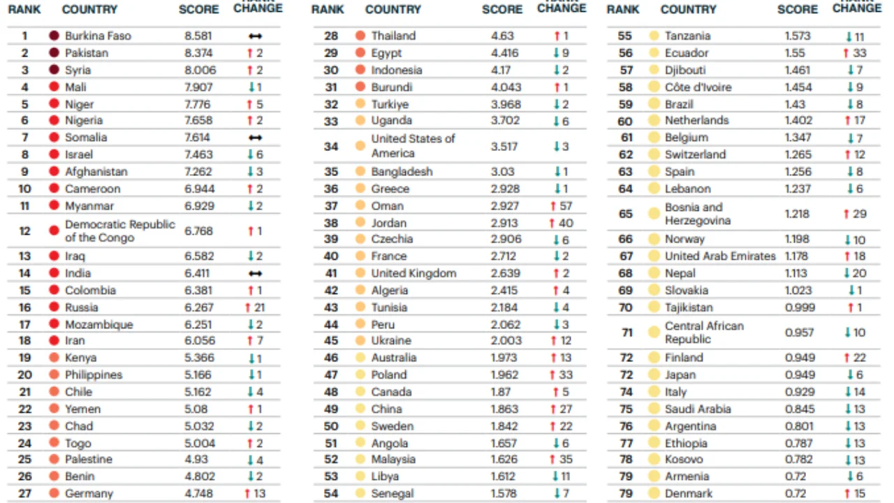 Eng xavfli o‘nlikda esa Burkina Faso, Pokiston, Suriya va Isroil kabi davlatlar joylashgan.