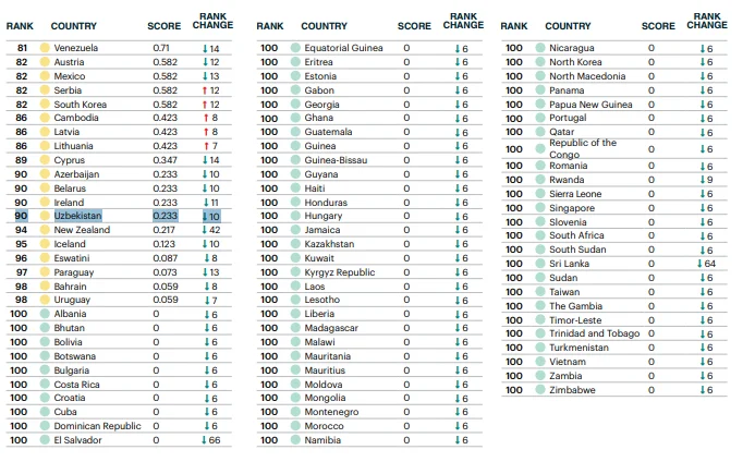 Hisobotda qayd etilishicha, O‘zbekiston AQSH, Kanada, Buyuk Britaniya, Fransiya, Germaniya, Ispaniya, shuningdek Rossiya, Xitoy, Tojikiston, BAA va Turkiyadan xavfsizroq deb baholangan. Turkmaniston, Qozog‘iston va Qirg‘iziston 100-o‘rin atrofidan joy olgan.