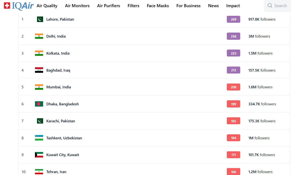 IQAir xalqaro platformasiga ko‘ra, ayni damda Tehron shahri havo ifloslanishi bo‘yicha dunyodagi poytaxtlar va yirik shaharlar ichida 10-o‘rinni egallamoqda.