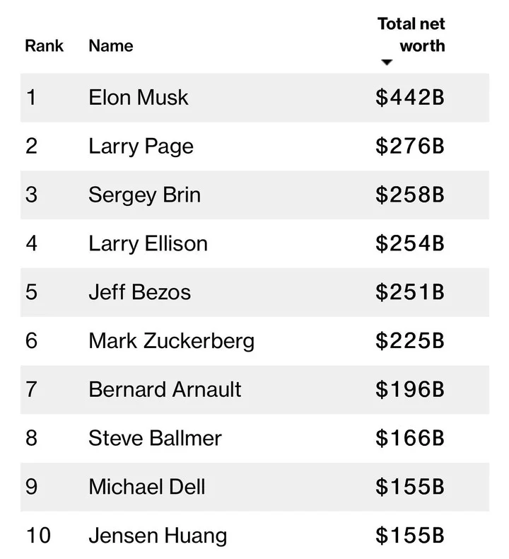 Tabiiyki, reytingning tepasida yana Ilon Mask mustahkam turibdi — 442 milliard dollar bilan. Bu raqam uni uzoq vaqt davomida eng boy inson sifatida mahkam ushlab turishiga imkon bermoqda.