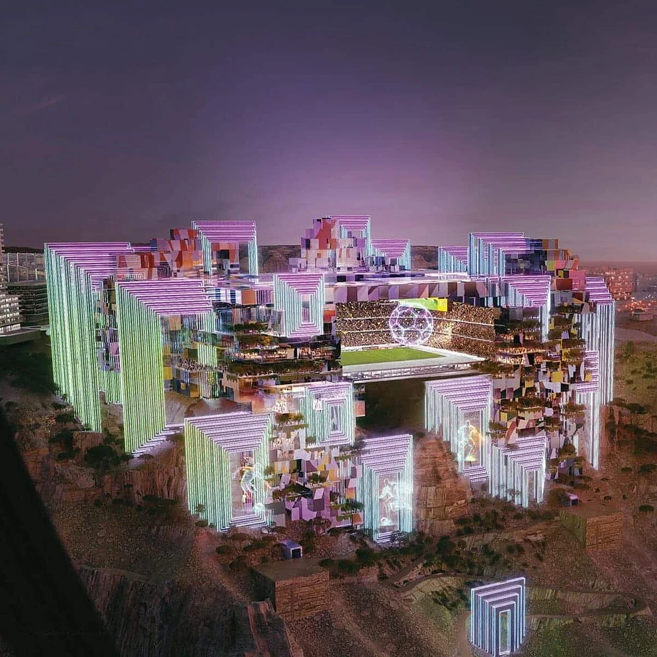 Raqamli ekranlar geometrik inshootning tashqi yuzalarini ham qoplaydi, arena atrofida esa sport va dam olish infratuzilmasiga ega minoralar qurilishi rejalashtirilgan. Bu hududlar tashrif buyuruvchilarni qoya chetidagi kuzatuv nuqtalariga olib boradigan, LED displeylar bilan bezatilgan yopiq ko'chalar orqali bog'lanadi. Stadion, shuningdek, Saudiya Pro ligasining "Al-Hilol" va "An-Nasr" klublari uchun uy stadioni bo'lib xizmat qilishi kutilmoqda.