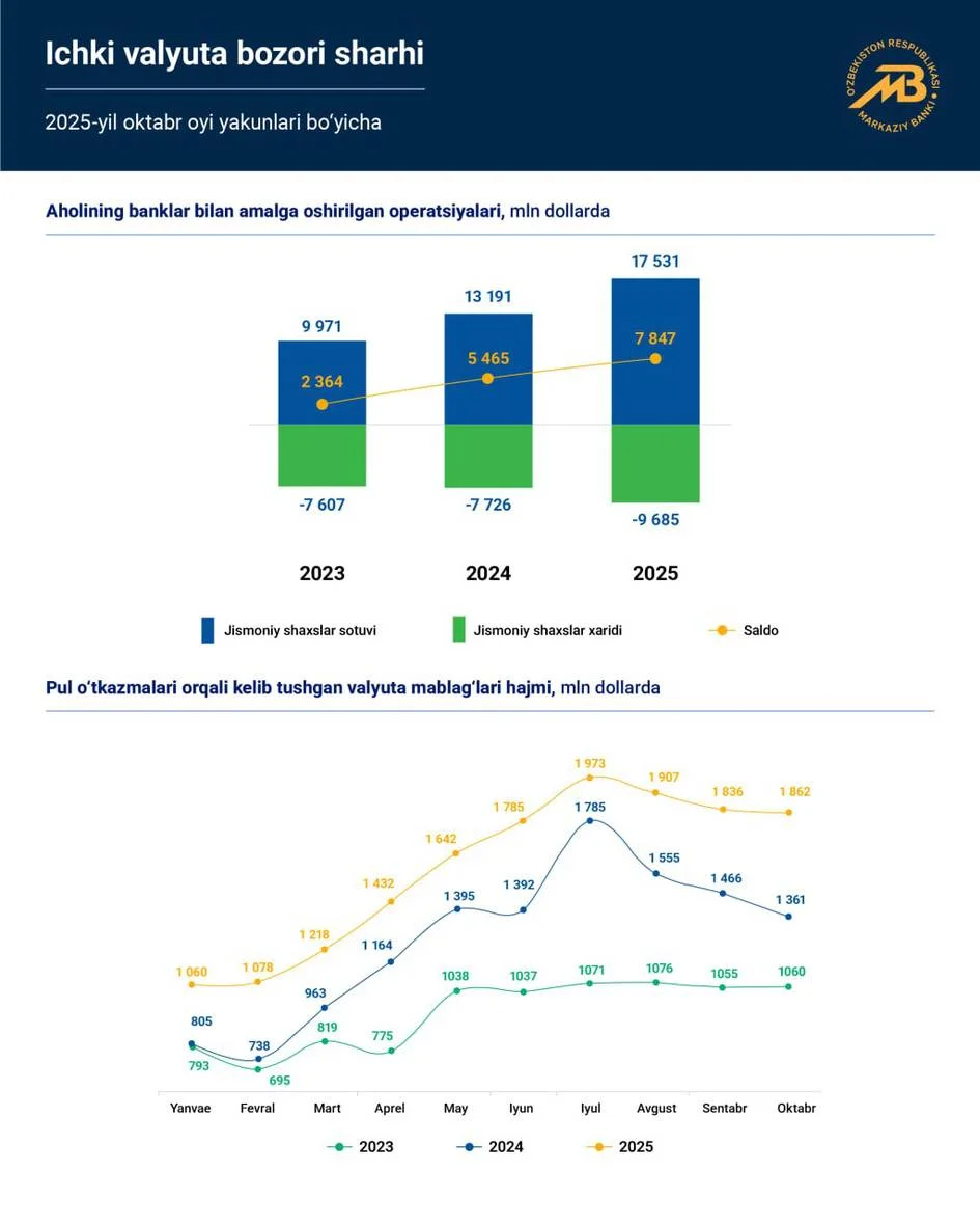 Eng diqqatga sazovor holat shundaki, aholi tijorat banklariga 10 oy davomida 17,4 milliard dollar sotgan. Bu – 2024-yilning mos davridagidan qariyb bir yarim barobar yuqori ko‘rsatkich. Mazkur raqam mamlakatda valyutani rasmiy kanallar orqali sotishga bo‘lgan ishonch va faollik ancha oshganini ko‘rsatadi.