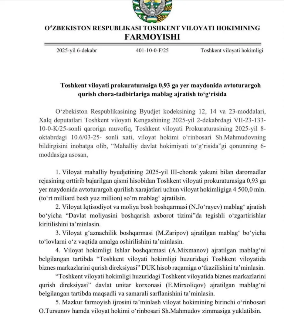 Hokimlik ma’lumotida qayd etilishicha, bu mablag‘ faqat avtoturargoh emas, balki katta kompleksning bir qismi sifatida ko‘zda tutilgan. Viloyat prokuraturasiga qarashli qariyb 1 gektar maydonda infratuzilmani zamonaviylashtirish bo‘yicha keng ko‘lamli loyiha amalga oshirilmoqda. Mazkur loyiha asosida: