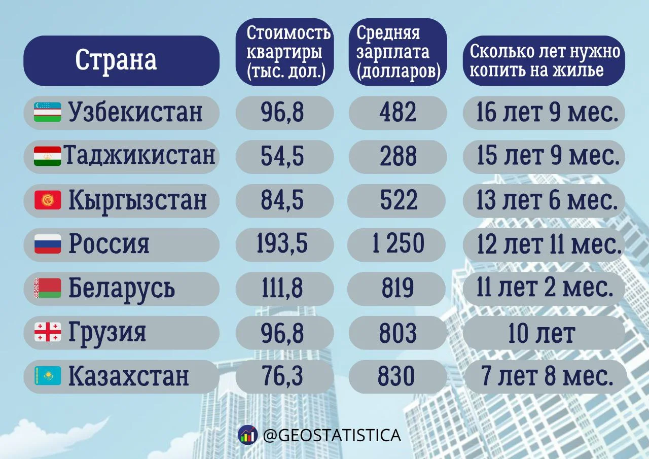 Qolaversa, Qirg‘iziston aholisiga uy-joy uchun jamg‘arish 13-yil 6 oyni, Tojikiston fuqarolariga esa taxminan 15-yil 9 oyni talab qiladi. Demak, mintaqadagi iqtisodiy sharoit, maosh darajasi va kvadrat metr narxlaridagi keskin farq ushbu muddatlar orasidagi katta tafovutni belgilab bermoqda.