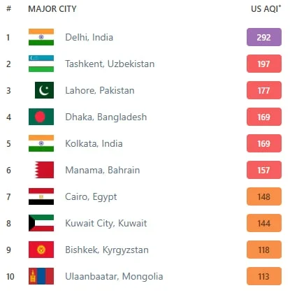 10 noyabr kuni Toshkent shahri havo ifloslanishi bo‘yicha dunyoda ikkinchi o‘rinni egalladi, deb xabar berdi IQAir.