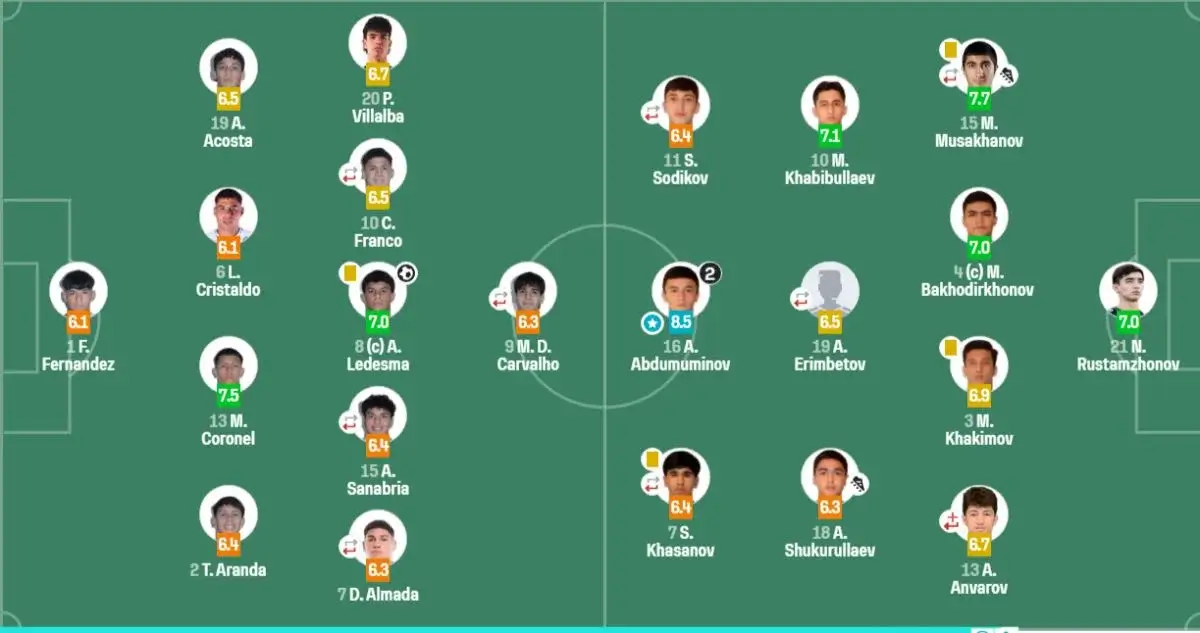 Qatardagi jahon chempionatida Paragvayni 2:1 hisobida mag‘lub etgan O‘zbekiston U-17 terma jamoasi futbolchilari Sofascore nashri tomonidan yuqori baholandi. Murabbiy Islom Ismoilov shogirdlari safida bir qator futbolchilar alohida ajralib turdi.