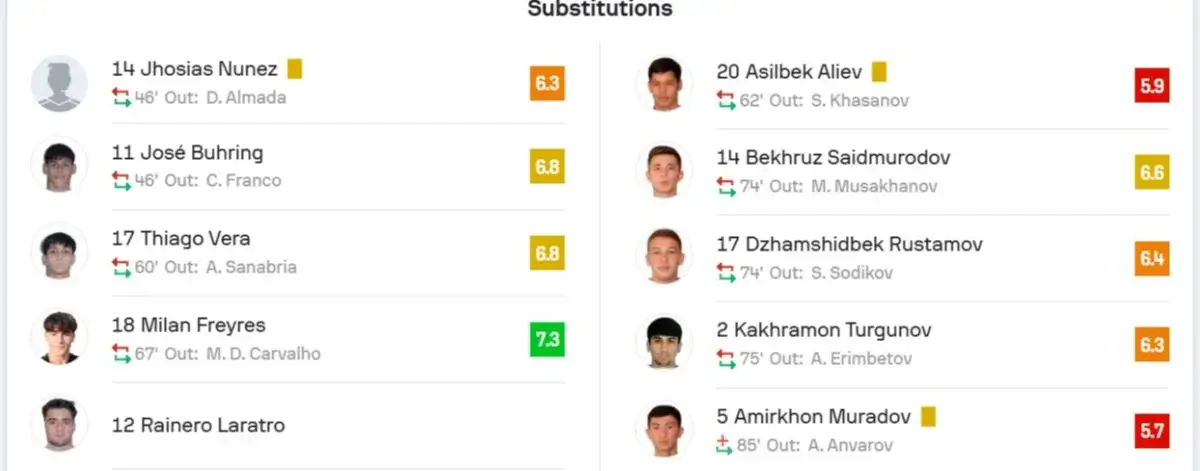 Muhammad Musaxanov (7.7), Muhammad Habibullayev (7.1) va Azizbek Erimbetov (6.5) ham ishonchli o‘yin ko‘rsatishdi. Himoya chizig‘ida Muhammad Hakimov (6.9) va Abdulmalik Anvarov (6.7) mustahkam o‘yin namoyish etdi.