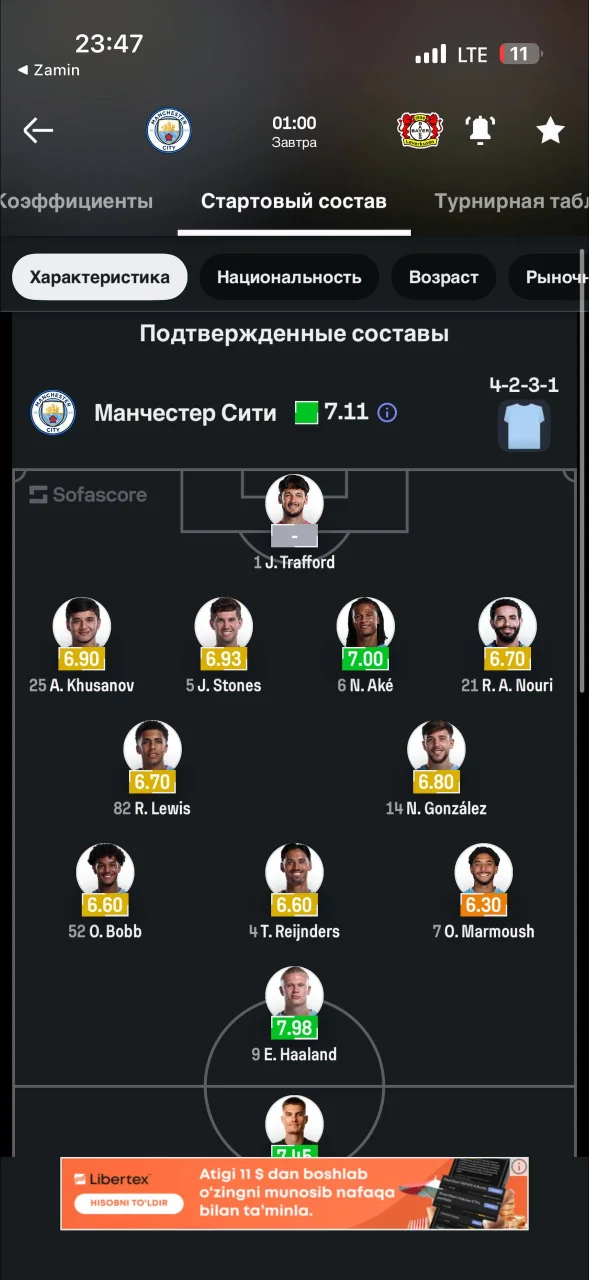 Bir necha turdan beri Pep Gvardiola jamoasida markaziy himoyada barqaror o‘ynayotgan Xusanov bugungi o‘yinni ham startda boshlaydi. Sofascore taqdim etgan tarkibda u 4-2-3-1 sxemasida Stouns va Ake bilan yonma-yon harakat qiladi.